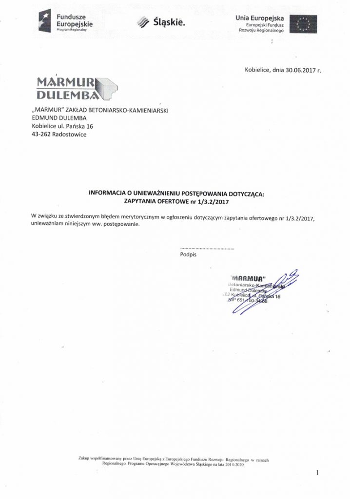 Informacja o unieważnieniu postępowania dotycząca: Zapytanie Ofertowe nr 1/3.2/2017.
